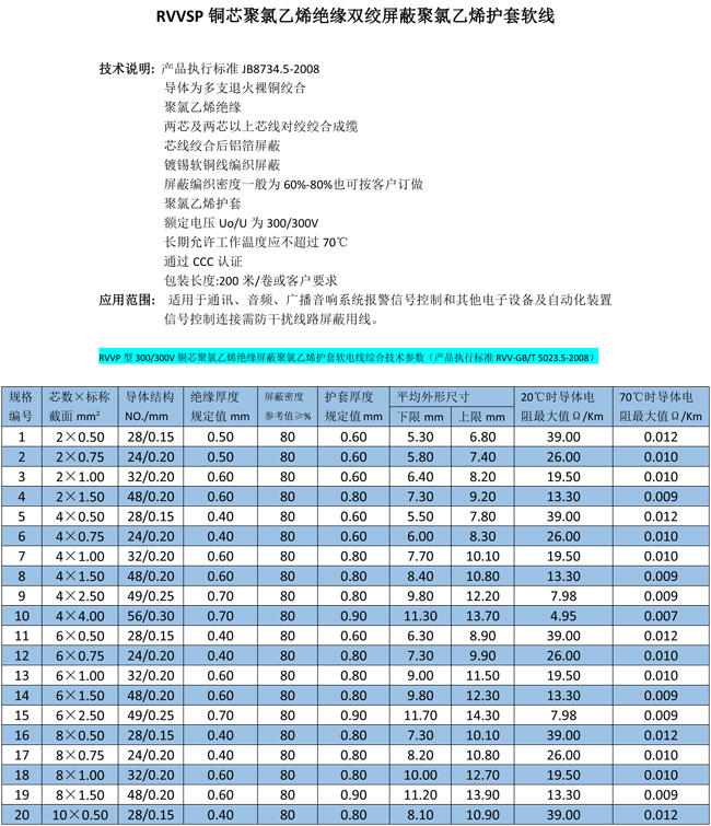 RVVSP銅芯聚氯乙烯絕緣雙絞屏蔽聚氯乙烯護(hù)套軟線