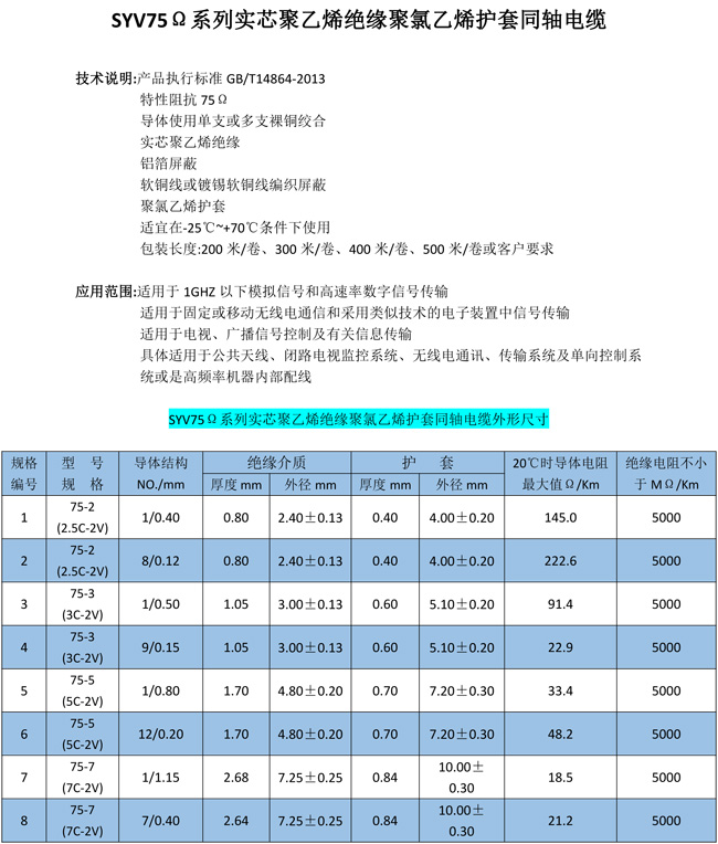 SYV75Ω系列實(shí)芯聚乙烯絕緣聚氯乙烯護(hù)套同軸電纜
